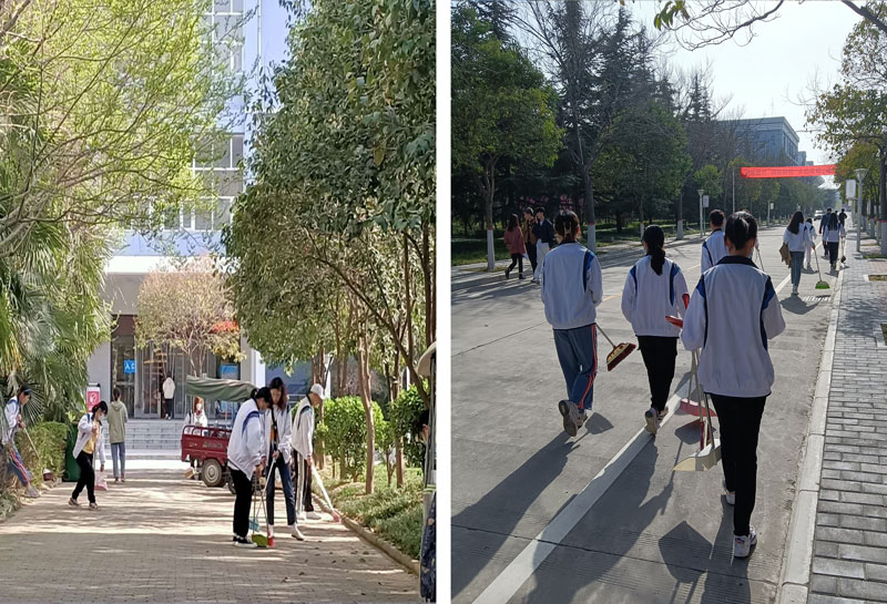 在志愿服务活动过程中,我院团学干部志愿者带着扫帚、抹布、铁锨等劳动工具,对校园的公共场所、卫生死角,及行政楼、国学院进行了清洁打扫。同学们热情高涨,清扫地面、擦拭门窗、捡塑料袋、矿泉水瓶,不怕累、不怕脏,经过一下午的劳动,校内环境焕然一新,与春意盎然的校园形成独居一格的美丽风景线。