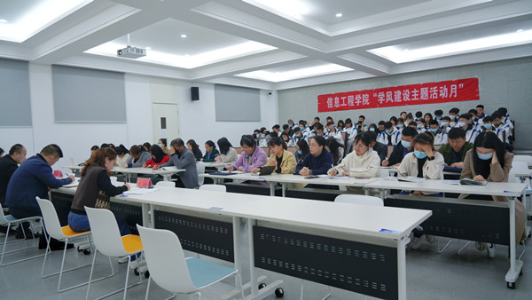 党总支副书记、学生主管罗雄宣读了信息工程学院的学风建设月活动方案,指出方案实施的目的在于引导学生树立“以学习为首要任务,成果为主要导向”的意识,加强对学生良好学习习惯的培养、督促学生养成正确学习行为,帮助学生实现学习状态的调整与转变,强调学院各部门要相互配合、积极联动,以班级班风建设为载体,以解决学生思想困惑为突破口,用学习探讨、学生项目申报及活动、参与四六级和考研为抓手,结合心理健康教育,课堂纪律管理等日常活动,深入开展党建引领、强化管理、督促践行、学业帮扶、榜样示范、评优表彰等系列教育实践,指导学生增强责任使命,培养良好学习习惯。