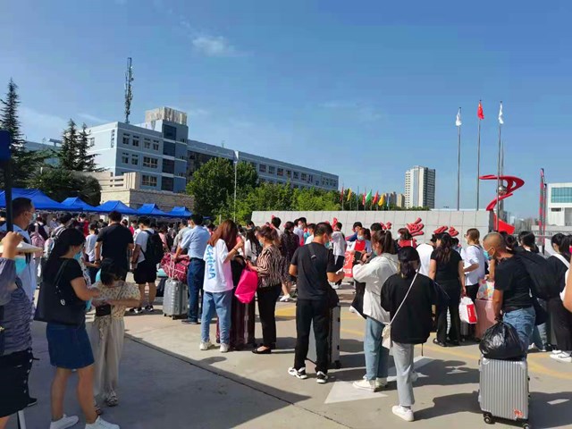 7点开始,就不断有学生和家长报到入校。按照严格的疫情防控相关规定,学生在一名家长陪同下,戴口罩、出示行程码、核酸检测报告、录取通知书、测温、消毒后进入学校,再去完成报名注册,成为新陕服人。