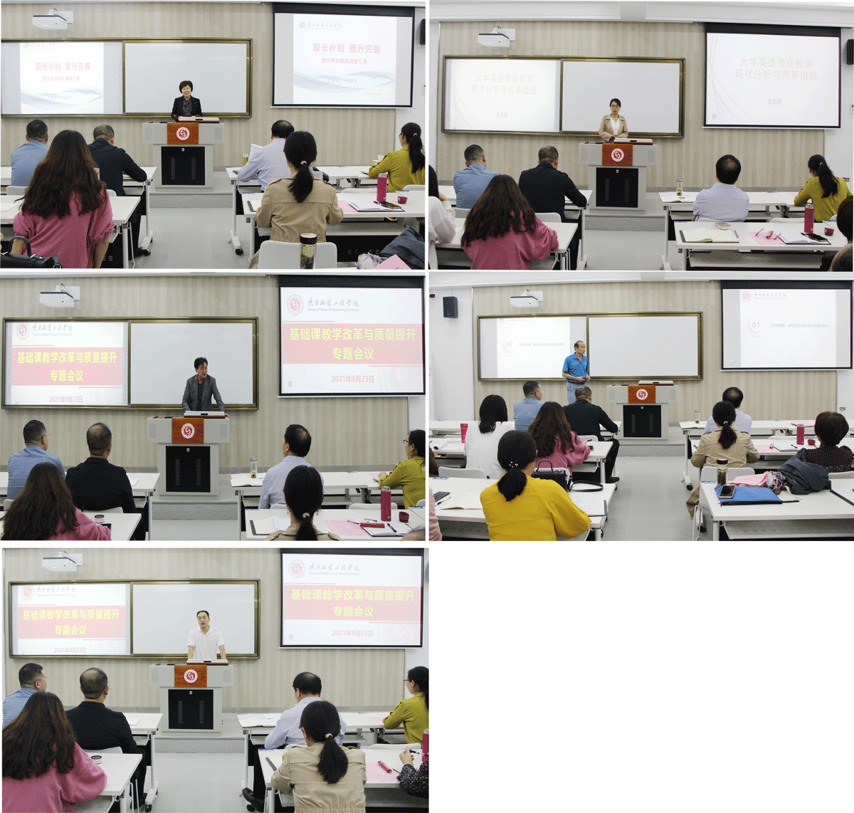 会上基础部主任马菊侠教授做了主题为取长补短,提升完善--部分民办院校调研汇报的报告;基础部副主任王改莉副教授做了主题为大学英语课程教学现状分析与改革措施的报告;马克思主义学院院长颜毓洁教授做了主题为新时代马院内涵建设的几点意见的报告;信息工程学院院长王立教授做了主题为《大学物理》课程教学现状分析与思考的报告;体育部副主任倪德财副教授做了主题为《民办高校体育课的现状与分析》的报告。