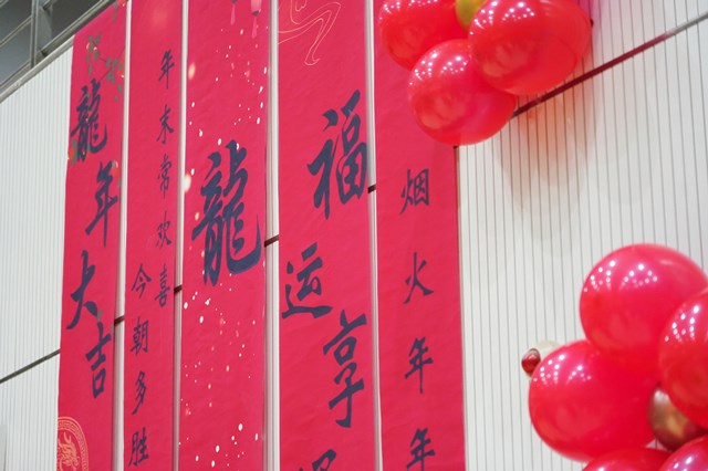 从二楼看台悬挂下来的数十幅师生春联作品,为晚会营造了浓浓的迎新气氛。