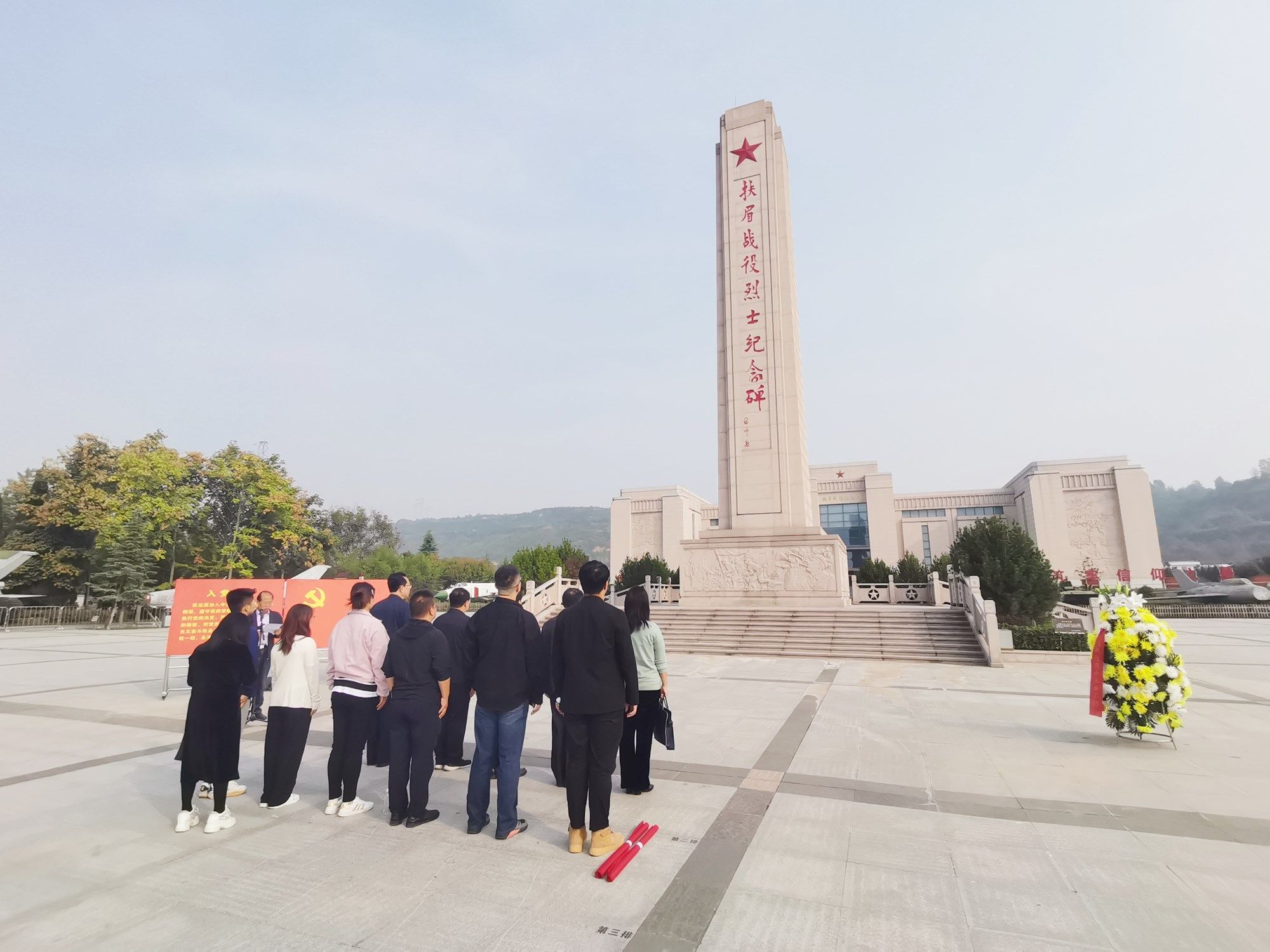 肃穆的红色广场上矗立着一座高大的纪念碑,上面是习仲勋题写的“扶眉战役烈士纪念碑”九个红色的大字,它的前面是指挥扶眉战役的五位首长彭德怀、贺龙、习仲勋、赵寿山、张宗逊石雕像。广场两边的青草坪上陈列着已经退役的战车大炮飞机,默默地述说着昔日金戈铁马、炮声隆隆的烽火岁月。