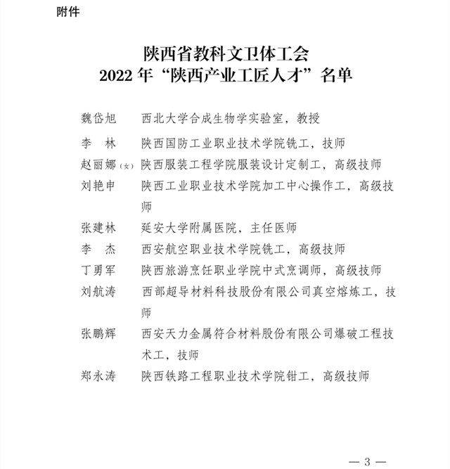 陕服新闻网讯(李文斌)近日,省教科文卫体工会为大力弘扬劳模精神、劳动精神、工匠精神,在全系统营造劳动光荣的社会风尚和精益求精的敬业风气,按照《陕西产业工匠人才培育计划》规定,经基层单位申报,省教科文卫体工会研究并报省总工会批准,命名 10 名同志为 2022 年“陕西产业工匠人才”,颁发证书和奖牌,并按照规定给予奖励。我校服装学院教师赵丽娜同志在表彰之列。