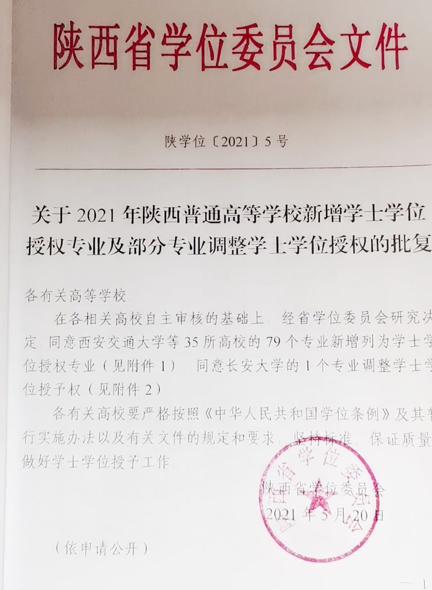 陕服新闻网讯(李文斌)日前,陕西省学位委员会下发陕学位[2021]5号文件,公布《关于2021年陕西普通高等院校新增学士学位授专业及部分专业调整学士学位授权的批复》,我校新增金融工程、学前教育两个学士学位授权专业。