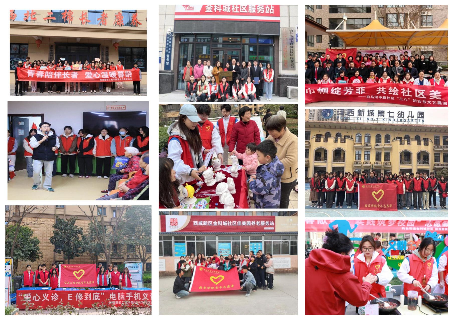 各学院积极动员青年志愿者帮助有需要的群体,党员带头走进基层,团员青年主动走入群众。校团委、校青年志愿者协会前往西北二棉长者康养中心开展了爱老敬老志愿服务活动,校学生会在秦之健社区服务中心开展了血压测量活动,传递社会关爱;服装学院走进沣西新城第七幼儿园、陈阳交警大队开展志愿服务活动,教育学院的“周末温暖陪伴”爱心活动、经济管理学院的“青春暖桑榆”活动、艺术设计学院开展“非遗进社区”活动,信息工程学院“三八”妇女节志愿服务活动,健康学院社区义诊,高职学院“马路学堂”等活动,以实际行动赋予雷锋精神新的时代内涵。
