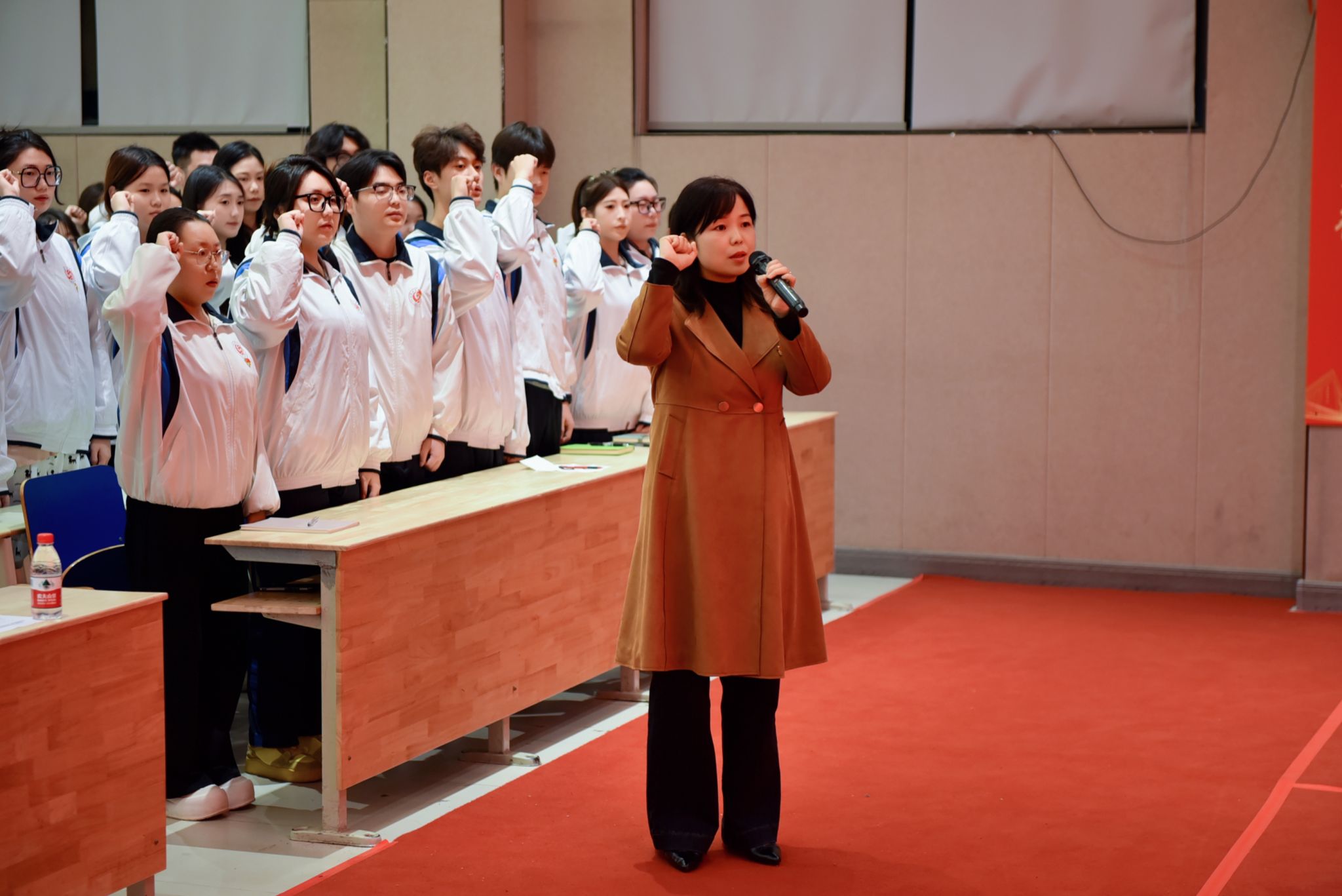 新接收预备党员代表、环境艺术设计专业2301班杨智勇发言,表示“将用实际行动践行入党誓言,履行党员义务,时时处处以党员的标准严格要求自己,争做合格党员”。服装学院学生第一党支部书记兼本期党校班主任崔凡发言,对预备党员表示祝贺和欢迎,并对参加党校第44期入党积极分子培训的学员寄予期望。