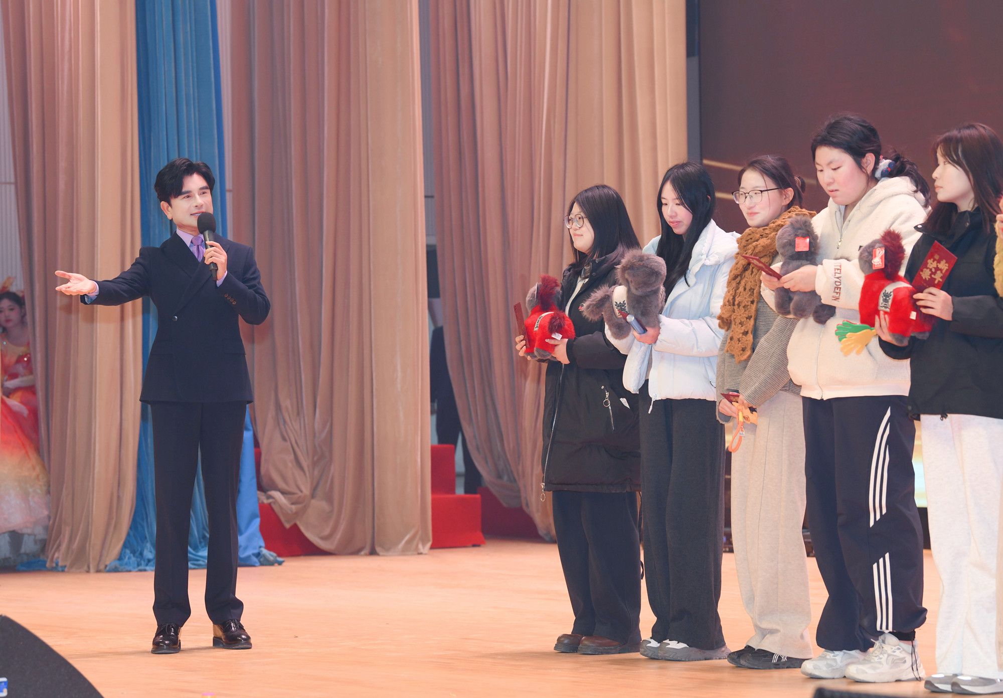 吕明董事长向全体师生送上新年祝福并讲话。他指出,过去一年,镐京集团高校以党的二十届四中全会精神为指引,坚持“内涵发展、科技强校”,教学科研提质增效,高质量发展迈出坚实步伐;展望2026,我们将锚定建设未来镐京大学核心战略,聚力三校六区建设,以创新驱动引领转型,以共建共享惠及民生,奋力书写“十五五”开局新篇章!吕明董事长深情演唱《天海一心》《战马》两首歌曲,还为同学们发放马年吉祥物玩偶,勉励两校师生在 2026年继续秉持守正创新理念,拥抱AI时代,拥抱健康生活,协同共享、逐梦前行,以更加昂扬的姿态共创辉煌。