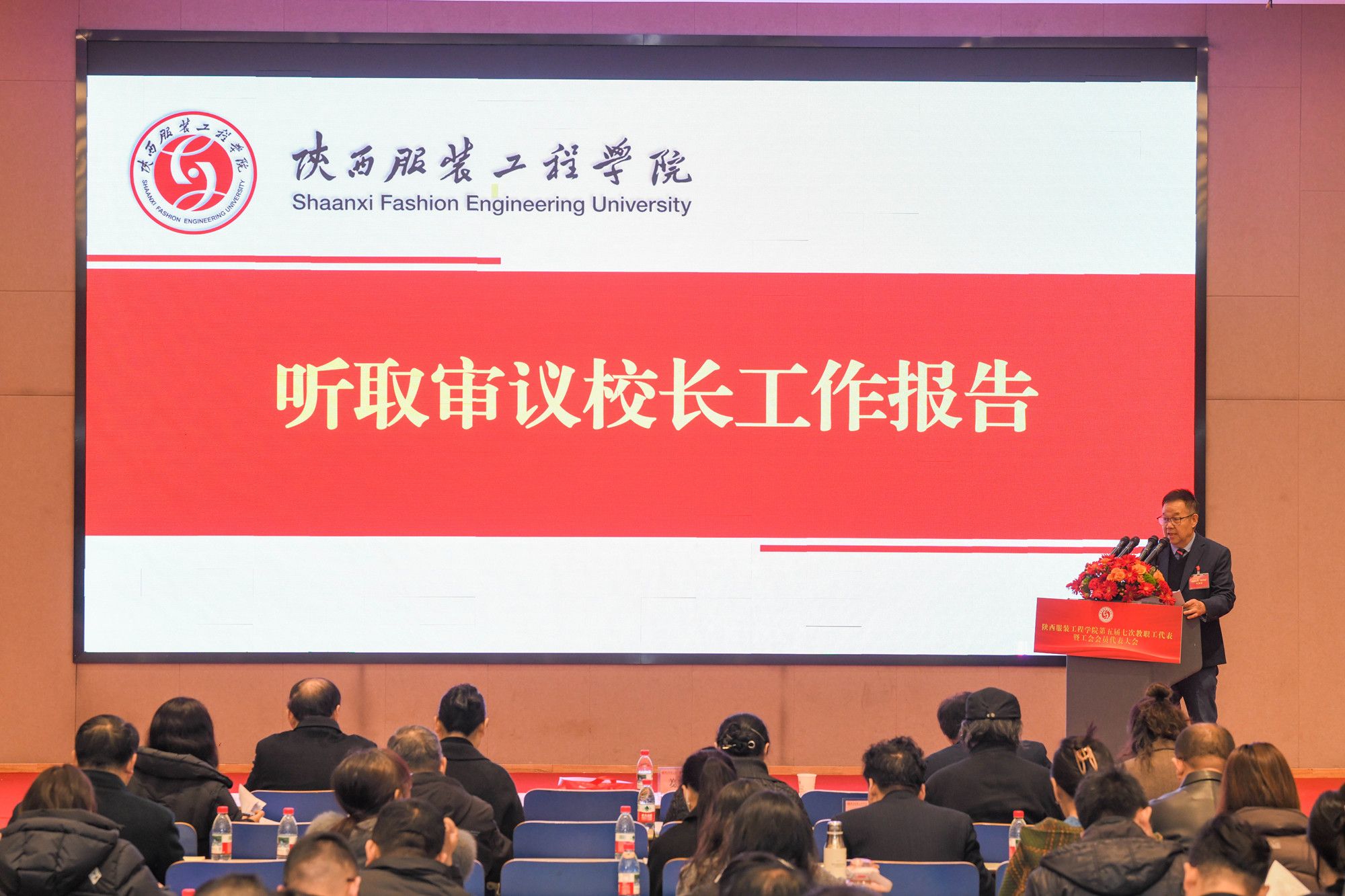 陕服新闻网讯(李文斌)3月10日,我校第五届第七次教职工代表大会暨工会会员代表大会(以下简称“双代会”)在E1-4报告厅召开。大会以“改革攻坚提质效,内涵发展谱新篇,为建设特色鲜明的一流应用型大学而努力奋斗”为主题,审议通过了校长工作报告、工会工作报告及提案征集处理情况报告,并原则通过了《陕西服装工程学院“十五五”发展规划(草案)》及《陕西服装工程学院自有专任教师第一轮聘期考核和第二轮岗位聘任实施办法》。大会127名正式代表、26名特邀代表齐聚一堂,共商学校发展大计。代表们围绕学校改革发展积极建言献策,提出了诸多富有建设性的意见建议,充分彰显了民主团结、求真务实的大会精神。